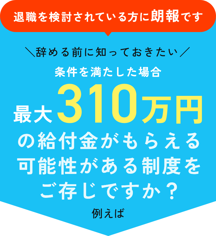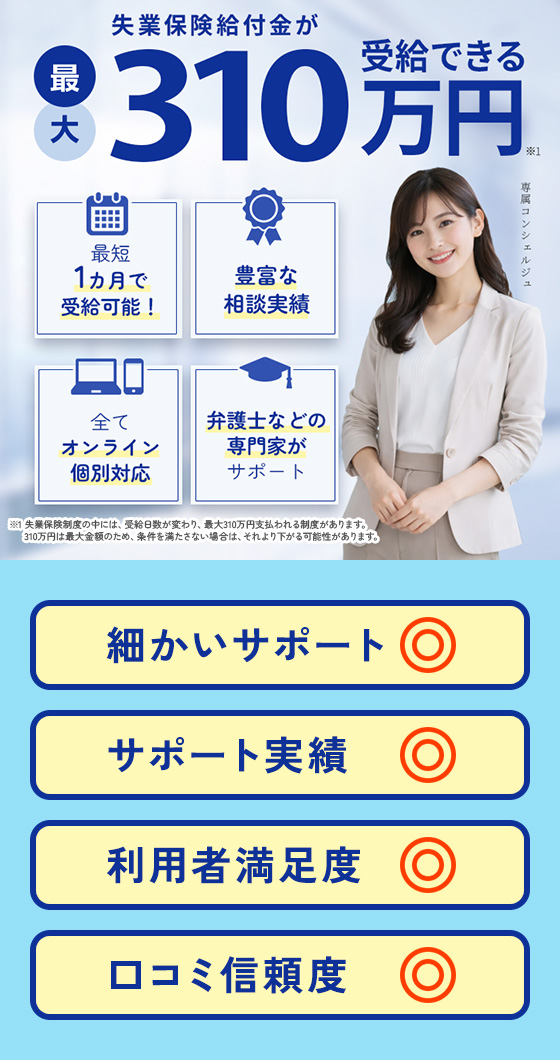条件を満たすことで、最大310万円の給付金を受け取れる可能性があり、手続きが順調に進めば、最短で1か月以内に給付が開始されるため、生活費や転職活動に必要な費用の心配をすぐに解消することができます。